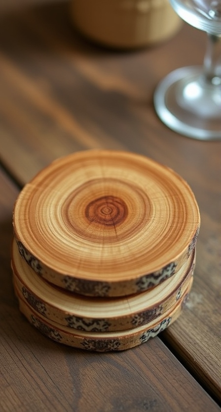 • Steps to Make It: Cut wood slices, sand the edges, and add protective varnish.