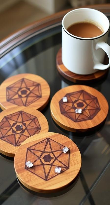Create a set of coasters by embedding small crystals into circular wooden blanks. Use a router or drill to carve shallow recesses, then secure the crystals with epoxy resin. Sand the edges for a polished finish and apply a waterproof sealant.