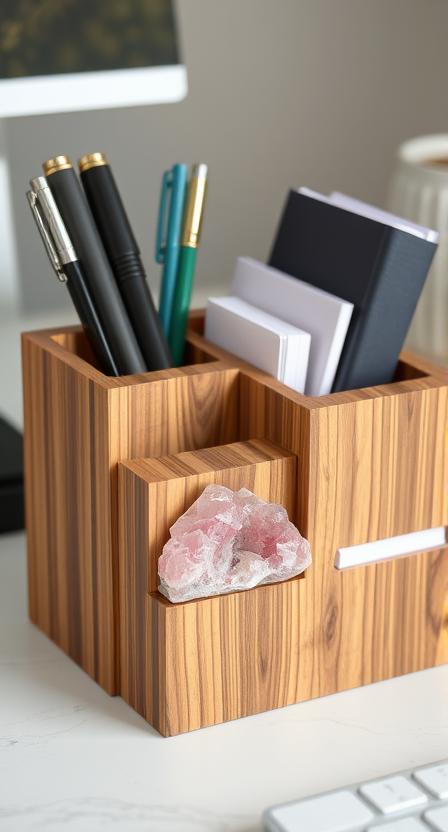 Build modular organizers with compartments for pens and papers. Highlight specific sections with embedded crystals for visual interest.