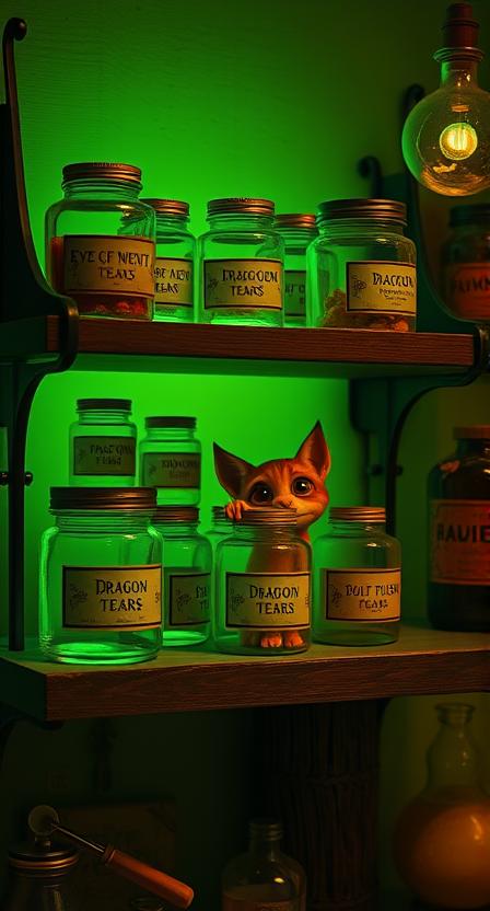 Build a small floating shelf from scrap wood. Paint it like a lab shelf with “POTION INGREDIENTS” labels. Place tiny jars (or painted bottle caps) filled with “eye of newt” (glitter) and “dragon tears” (blue beads). Frankie-approved!