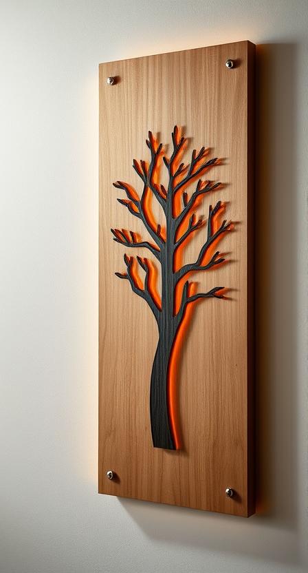 Tree silhouette wall panels are an elegant way to bring the outdoors inside. These pieces often feature wood-burned or laser-cut silhouettes of trees against neutral backgrounds. The contrast between dark silhouettes and light natural wood creates a striking visual effect. Use them as standalone statement pieces or group several together for a gallery wall.