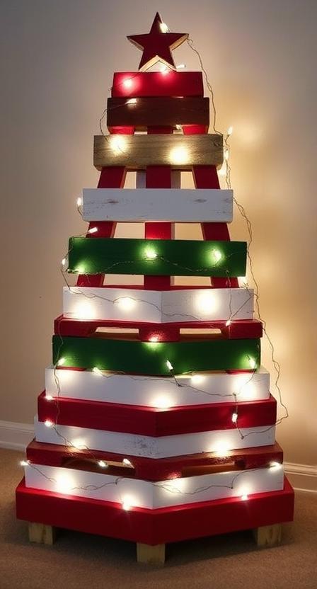 Stack slices of pallet wood or driftwood to create modern Christmas trees. Paint each slice in festive colors or wrap them with string lights for added sparkle. These towers double as holiday decorations and storage solutions for ornaments or gifts.