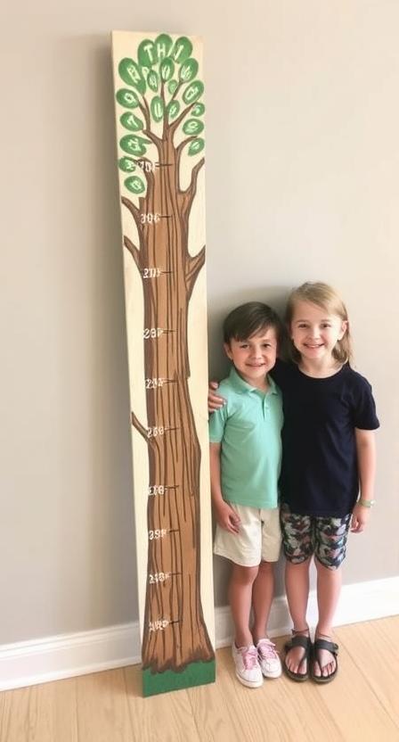 Track children’s height with wooden tree growth charts. Carve or paint tree trunks and branches onto long planks, marking inches or centimeters along the way. These charts double as educational tools and decorative pieces.